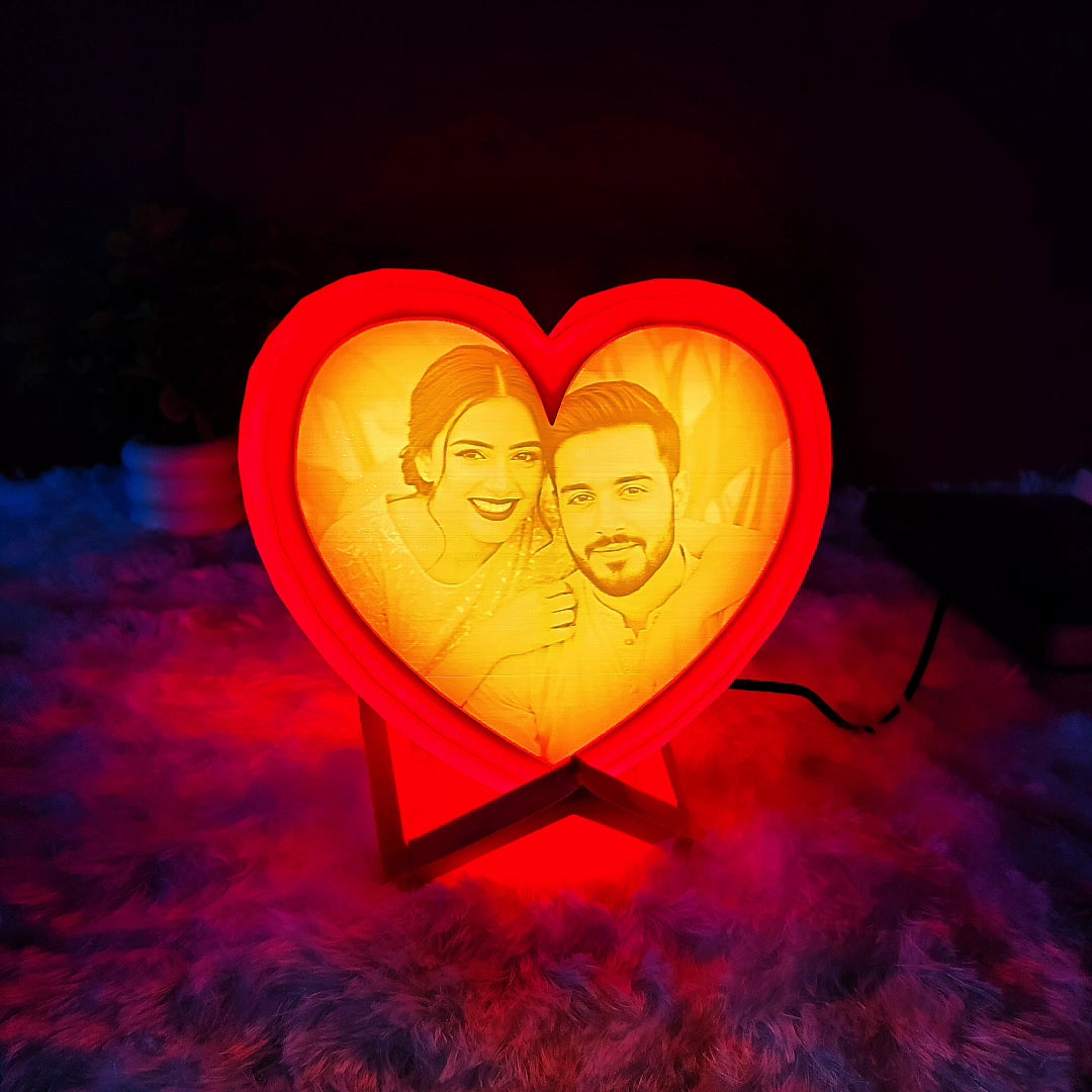 The red heart-shaped frame with a white front photo lithophane creates a premium warm white glow when lit up, highlighting every detail of your photo. It comes with a 3D printed stand for easy display and a 12V DC adapter, ensuring long-lasting brightness.